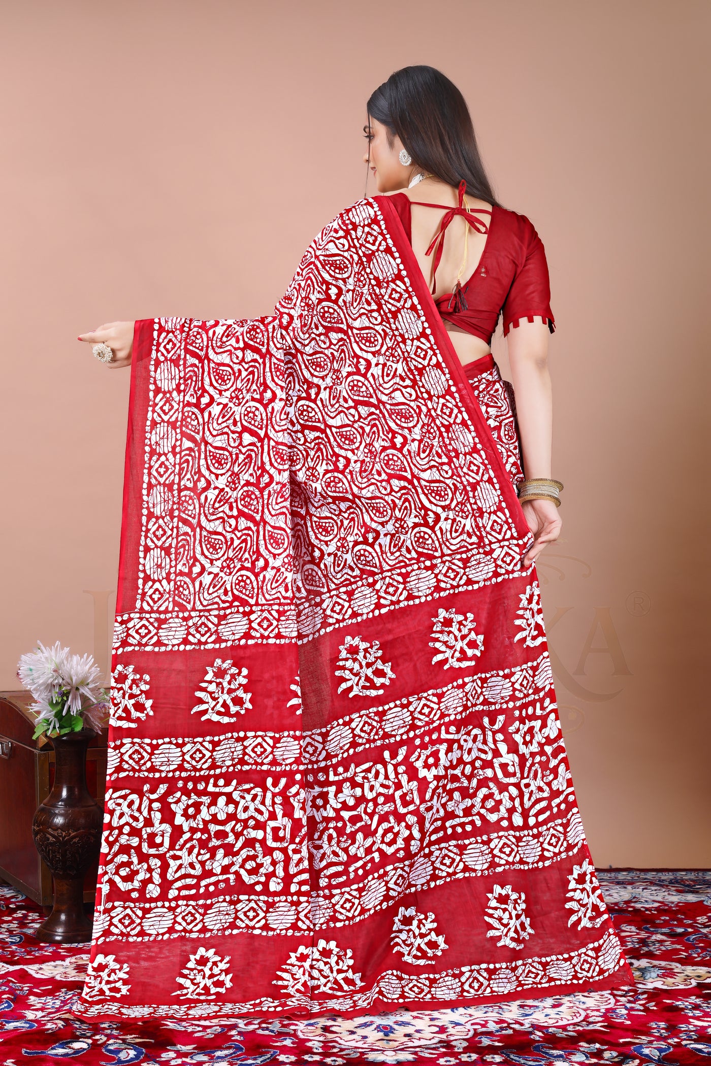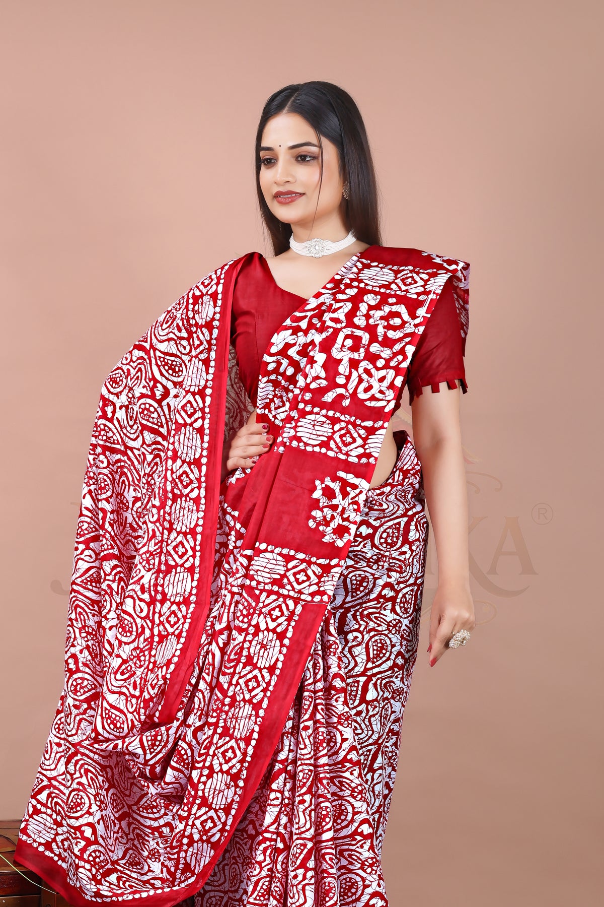 Red Batik Cotton Printed Saree Jay Radhika Textile