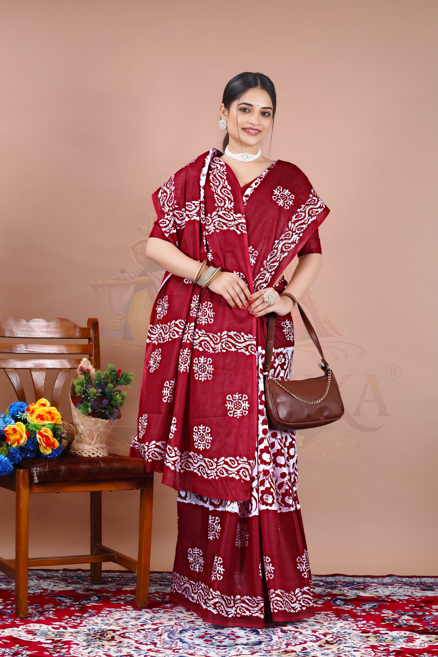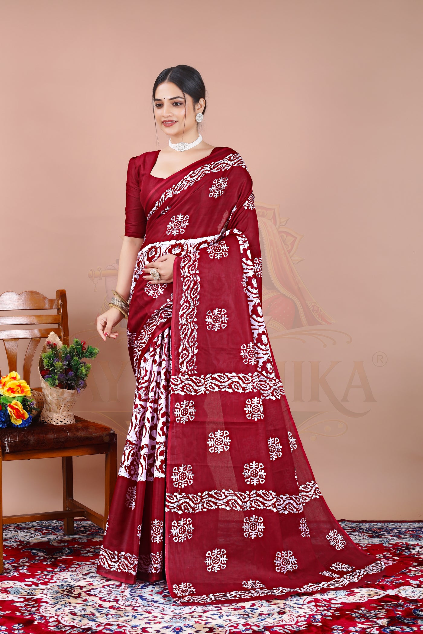 Maroon Batik Cotton Printed Saree