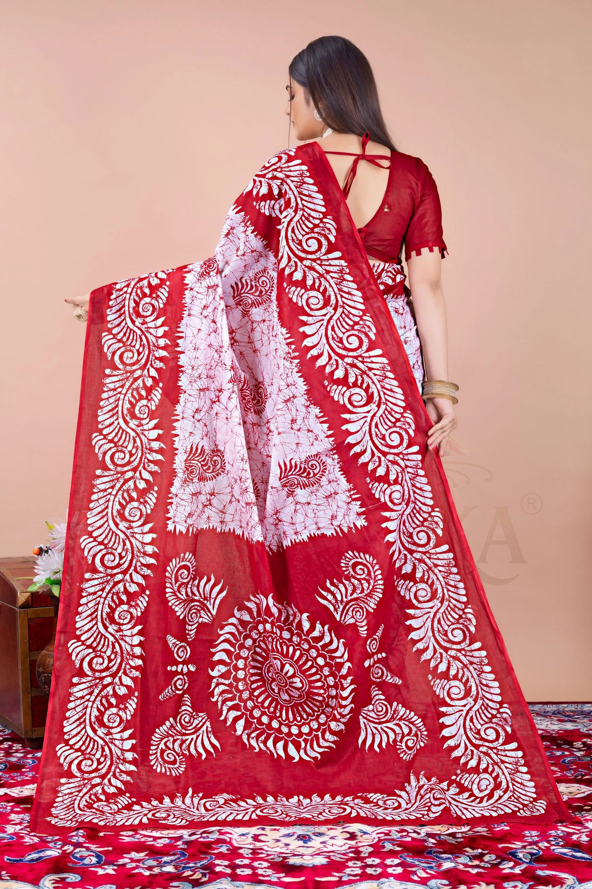 Red White Batik Printed Cotton Saree